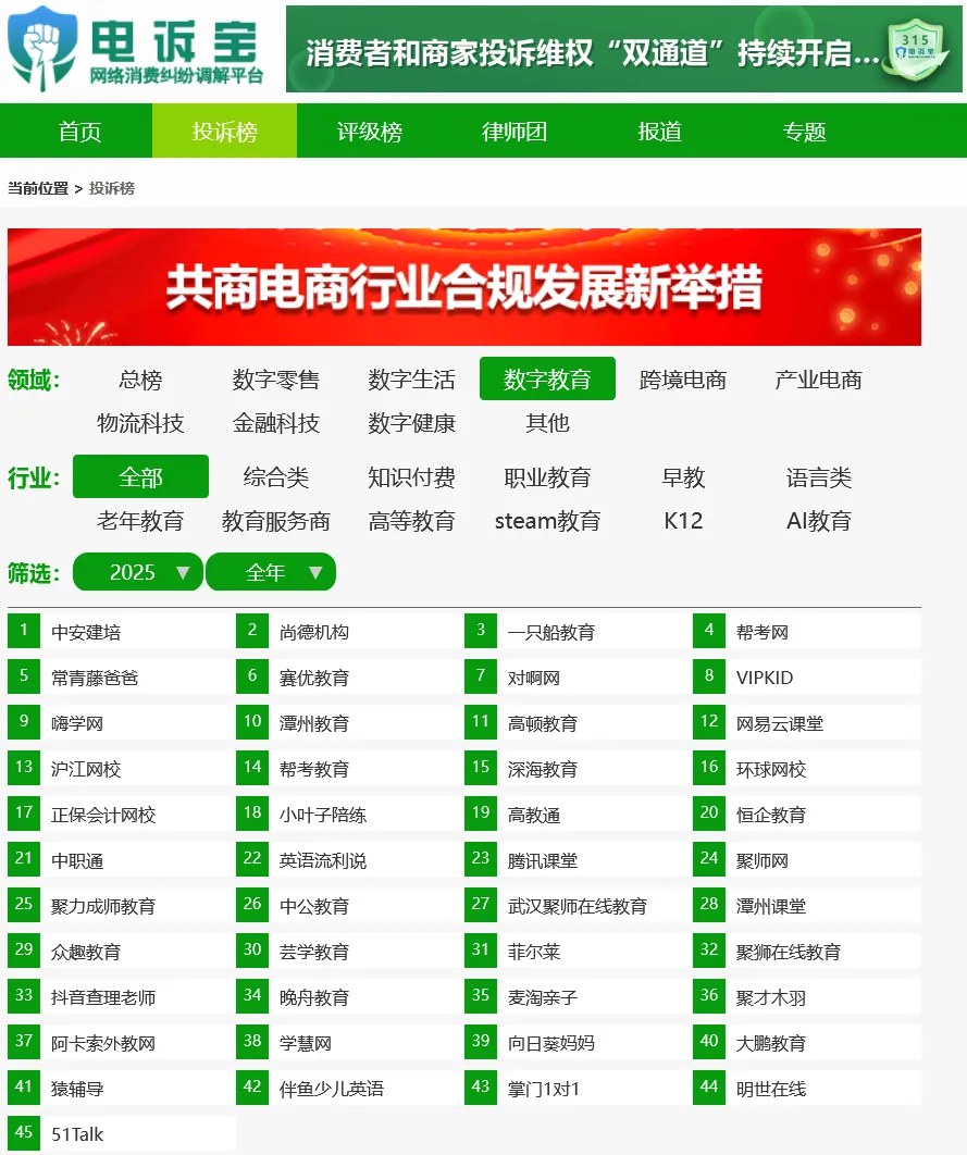 此外,“电诉包”受理2025年数字教育投诉按投诉量排名依次为:中安建培、尚德机构、一只船教育、帮考网、常青藤爸爸、塞优教育、对啊、VIPKID、嗨学网、潭州教育、高顿教育、网易云课堂、沪江网校、帮考教育、深海教育、环球网校、正保会计网校、小叶子陪练、高教通、恒企教育、中职通、英语流利说、腾讯课堂、聚师、聚力成师教育、中公教育、武汉聚师在线教育、潭州课堂、众趣教育、芸学教育、菲尔菜、聚狮在线教育、抖音查理老师、晚舟教育、麦淘亲子、聚才木羽、阿卡索外教网、学慧网、向日葵妈妈、大鹏教育、猿辅导、伴鱼少儿英语、掌门1对1、明世在线、51Talk。