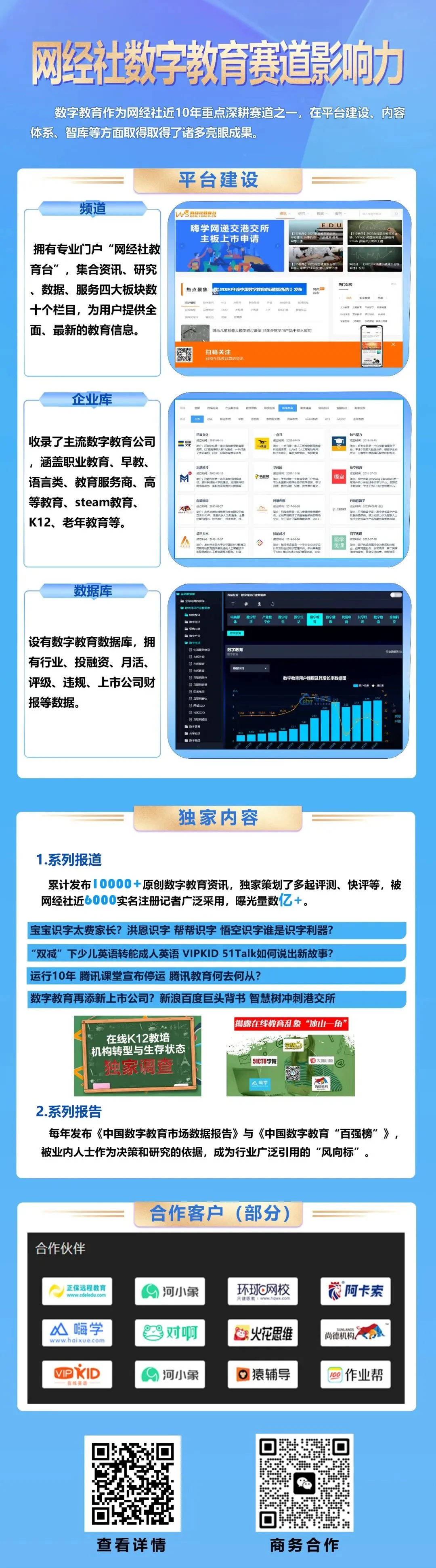 网经社深耕数字经济行业18年,长期关注数字教育,我们重点报道和研究的公司有:(1)综合类:淘宝教育、高途、十方融海、网易有道、平安好学、新东方在线等;(2)K12类:猿辅导、作业帮、小盒科技、洋葱学园等;(3)语言类:VIPKID、阿卡索、英语流利说、51Talk、伴鱼等;(4)职业教育类:正保远程教育、对啊网、嗨学网、尚德机构、高顿网校、中公网校、UMU、粉笔科技、环球网校、量子之歌等;(5)高等教育类:智慧树、三节课、智课、学堂在线等;(6)素质教育类:编程猫、火花思维、幻码星球、河小象、小码王、核桃编程、西瓜创客、小叶子智能陪练、学而思网校、豌豆思维等;(7)早教类:常青藤爸爸、凯叔讲故事、宝宝巴士、小伴龙、洪恩等;(8)教育服务商类:校宝在线、飞象星球、云思智学、云学堂、百家云、华渔教育、极课大数据、翼鸥教育、掌通家园、校管家、松鼠Ai、一起教育科技、爱学习、纳米盒、智慧校园、爱学堂、鹰硕智慧教育、精准学等。