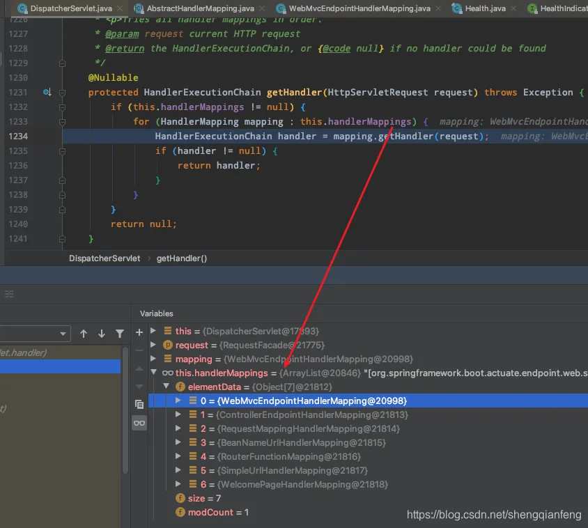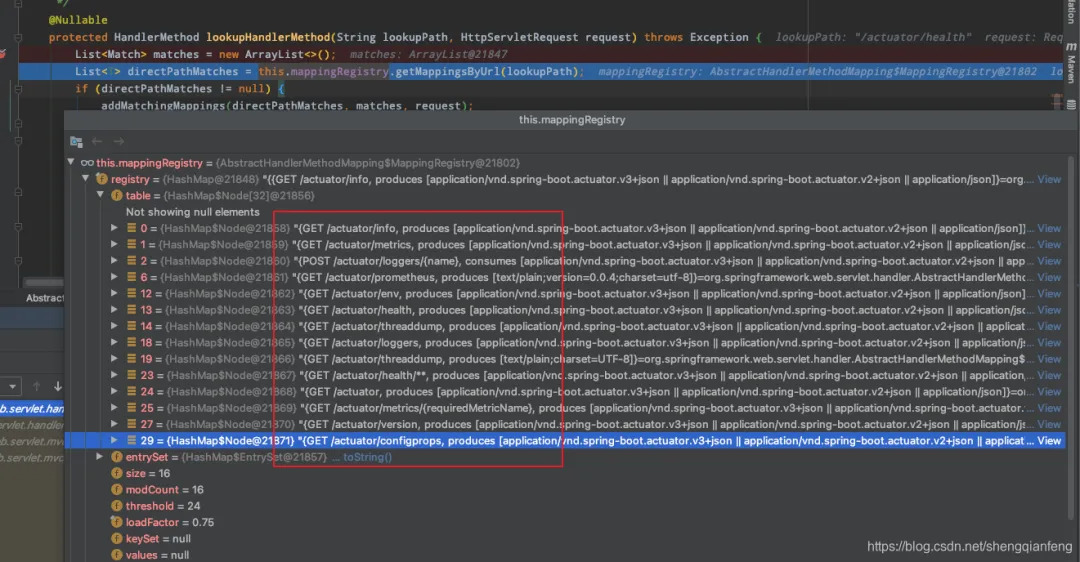 这里很明显的有一个mappingRegistry映射注册表,里边其实就是urlHandlerMapping的映射关系集合。那么,就可以从mappingRegistry映射注册表中找到/actuator/health的HandlerMapping。