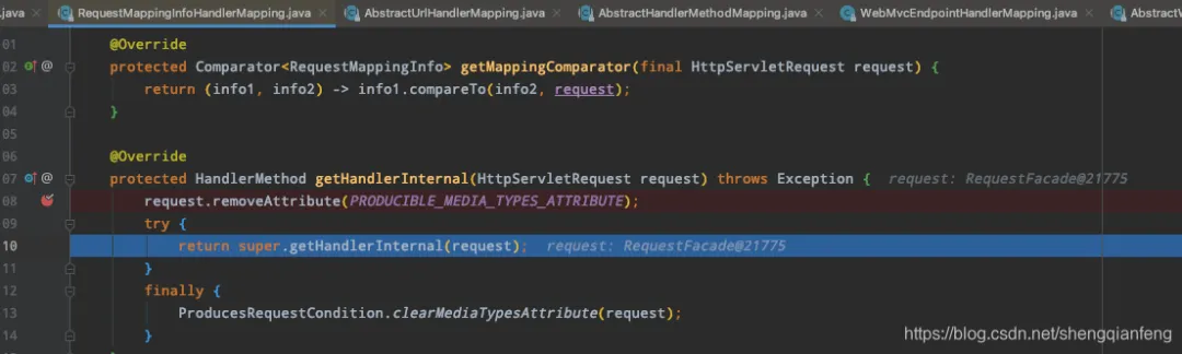 它继承了AbstractWebMvcEndpointHandlerMapping,而这个抽象的mapping类又继承了另外一个看起来更为眼熟的RequestMappingInfoHandlerMapping,接着这个”大众脸”的mapping又继承了另一个更为大众脸的抽象的AbstractHandlerMethodMapping。下图调的getHandlerInternal方法就前面提到RequestMappingInfoHandlerMapping中,但它又调了super的—也就是抽象类中的那一个AbstractHandlerMethodMapping的getHandlerInternal方法,如下图所示。看起来听绕的,但也不过都是一层层的继承关系,只不过层次稍微多了点。