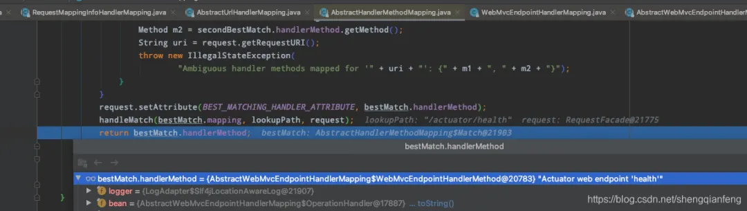 看下这个方法,其中的流程是先找到了请求的路径lookupPath即/actuator/health.然后根据这个path在mappingRegistry里找映射的handlerMethod。