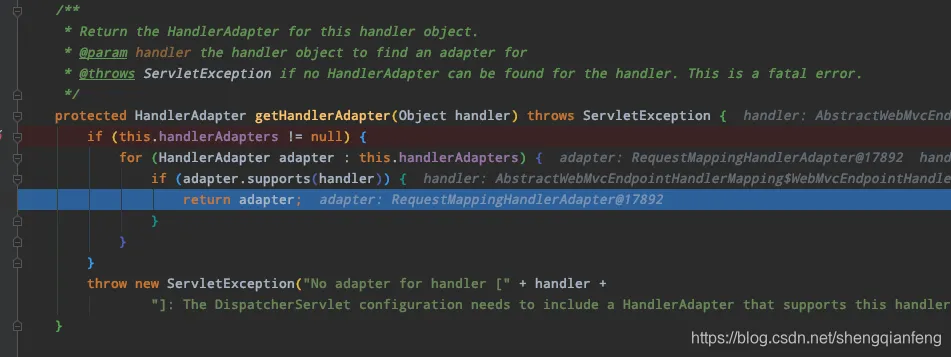 // Determine handler adapter for the current request.HandlerAdapter ha = getHandlerAdapter(mappedHandler.getHandler());