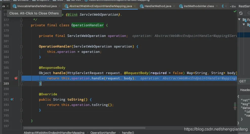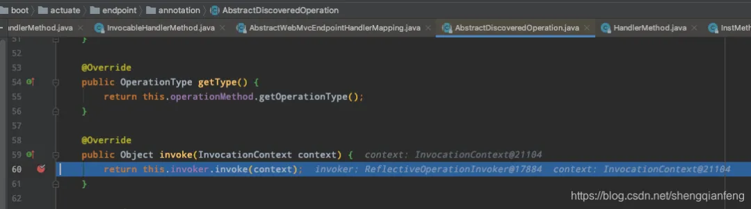 - getBridgedMethod()://就是HandlerMethod的方法。org.springframework.boot.actuate.endpoint.web.servlet.AbstractWebMvcEndpointHandlerMapping$OperationHandler#handle**(HttpServletRequest, Map)- getBean()://就是org.springframework.boot.actuate.endpoint.web.servlet.AbstractWebMvcEndpointHandlerMapping$OperationHandler。