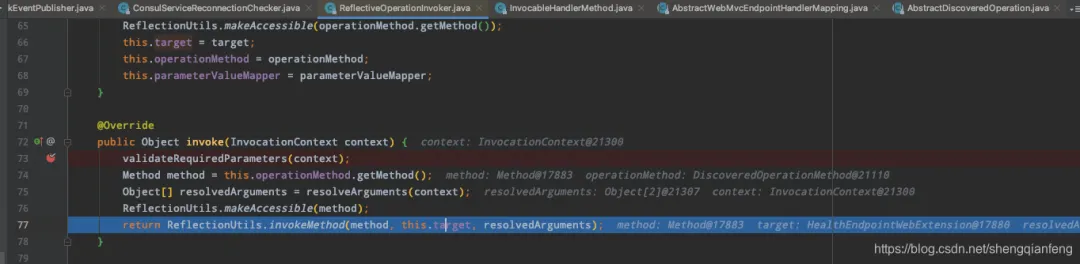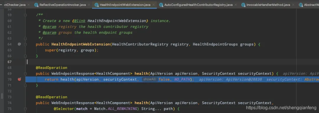 看下图就是利用反射机制执行这个invoker的target对象(HealthEndpointWebExtension对象)的health方法。