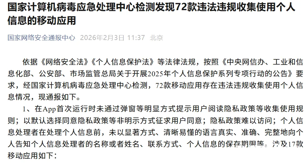 据悉,2025年12月26日至2026年1月20日期间,经国家计算机病毒应急处理中心检测,72款移动应用存在违法违规收集使用个人信息情况。