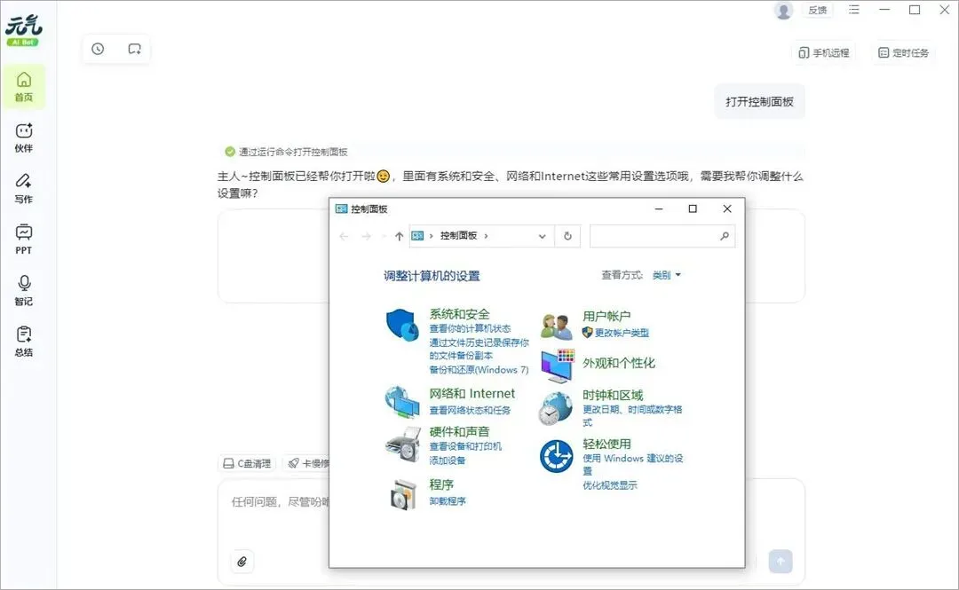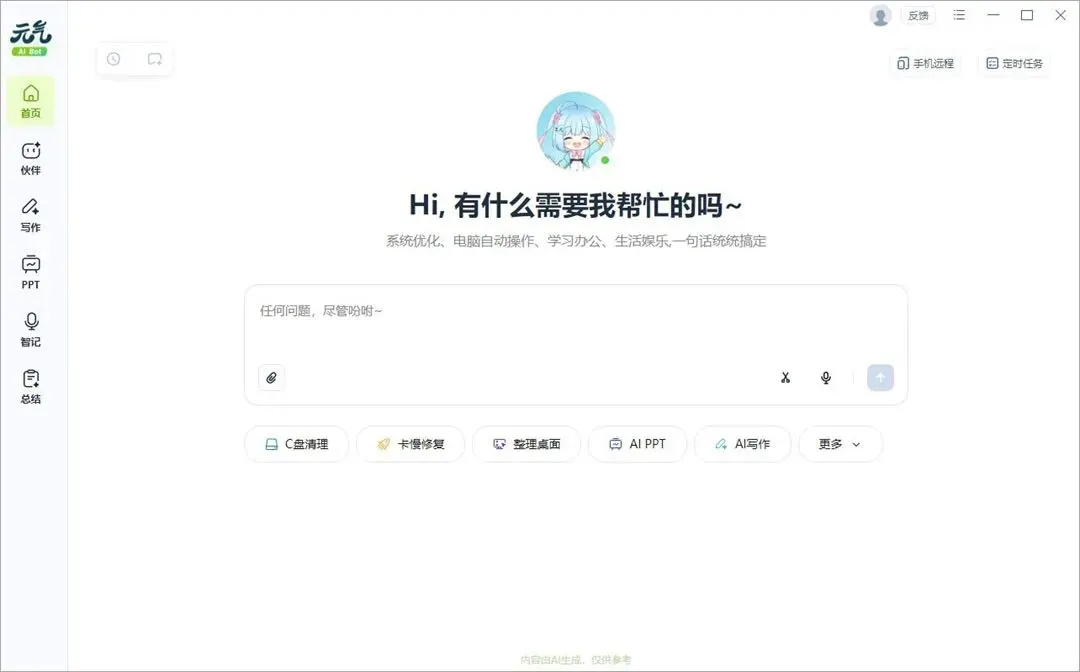 元气AI Bot是一款与Clawdbot类似的国产全能电脑AI助手,能够通过对话执行真实任务。其界面设计简洁清爽,操作易上手,功能丰富,既能实现AI写作、PPT生成、智能记录及会议总结等办公需求,也能一键完成C盘清理、桌面整理、声音修复、卡顿优化等电脑维护功能,响应迅捷,一句话就可以解决电脑难题。值得一提的是,元气AI Bot还内置了桌宠陪伴系统,拥有元气、毒蛇、呆萌、直球等多种性格选择,支持语音与文本双向交互,聊天随心。此外,元气AI Bot通过与飞书、钉钉、QQ深度互联,用户可用手机远程操控电脑执行各类指令,无论学习办公还是生活娱乐,都能轻松驾驭。有需要的用户可以在网盘下载使用~