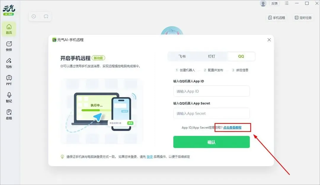 4、在手机飞书或钉钉的工作台中添加元气AI Bot,可发送指令远程控制电脑