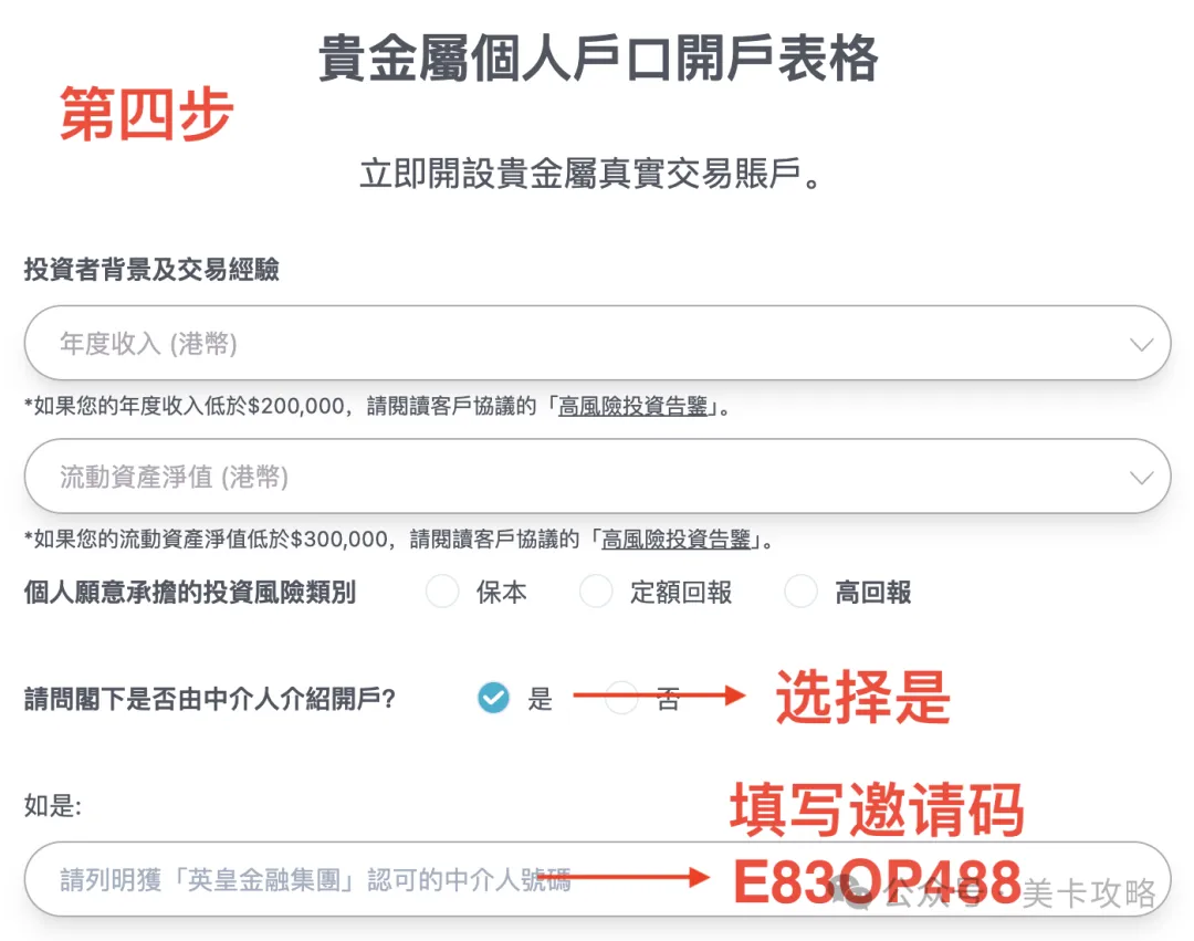 填写个人财务和投资经验,注意一定要在 ”是否由中介人介绍开户“一栏选择 ”是“,然后输入专属邀请码【E83OP488】,否则拿不到开户奖励