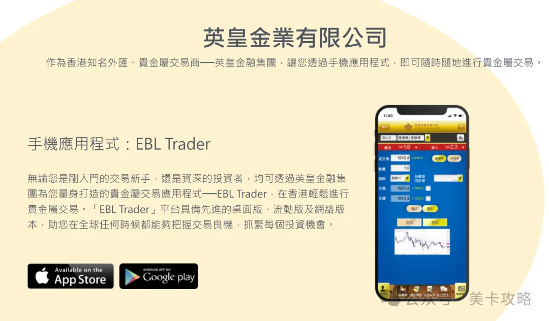 打开手机应用商店搜索英皇金业,下载即可(美区输入 EBL Trader),如果在内地使用APP需要科学上网