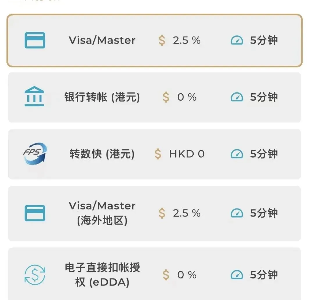 Visa/Master信用卡,银行转账,转数快,Visa/Master信用卡(海外地区),eDDA授权转账,可以根据需要自行选择。(香港信用卡入金选择”visa/master“,海外信用卡选择”visa/master海外地区“)