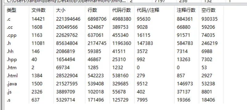 而归属 third_party+device/hisilicon/third_party 的代码行数为 7607742(不考虑 Html/html)。