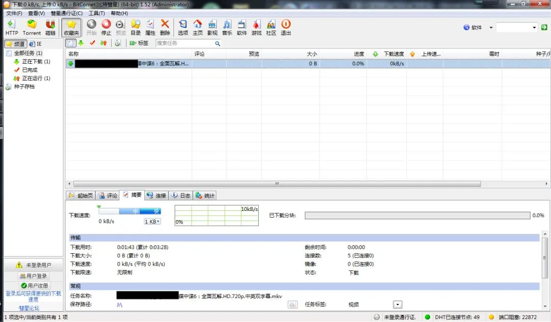 在更换了几个资源之后,BitComet开始进入下载模式,但下载速度仍然让人捉急。