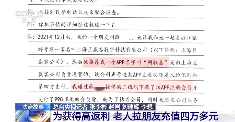 上海市公安局杨浦分局经侦支队金融犯罪侦查队民警 金力:由于老板自己年纪也比较大,他们针对中老年人设置App时,就把门槛放低。当老年群体抱着试试看态度下载,再推荐给别人,就已经成为他们当中的一环了。