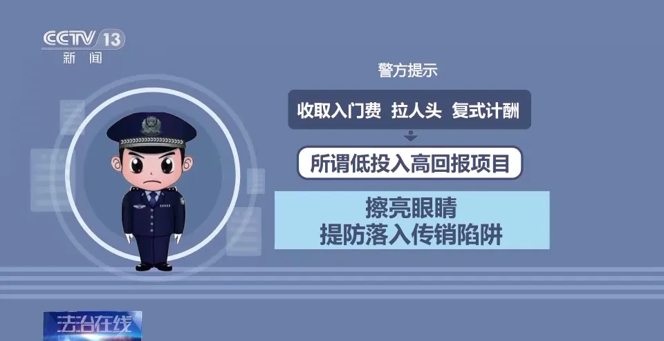 相比传统线下传销,网络传销活动传播速度更快,影响范围更广,隐蔽性更强。近年来,传销骗局不断更换外衣,还会借以“资本运作、消费返利、推荐奖”等当由头。警方提示,生活中如果遇到收取入门费、拉人头、复式计酬的所谓低投入高回报项目,一定要擦亮眼睛,提防落入传销陷阱。