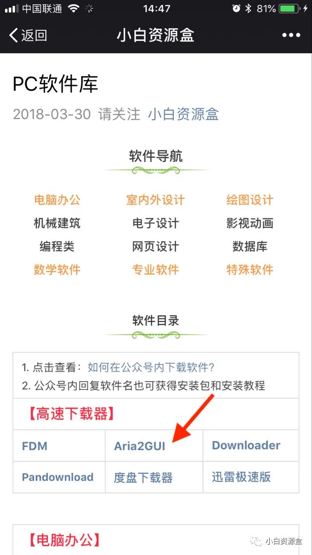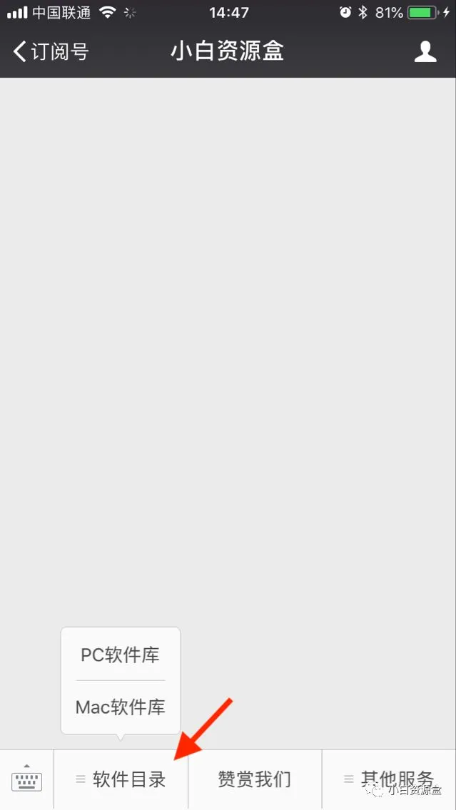 1. 进入小白资源盒公众号,点击软件目录, 以“PC软件库”为例;