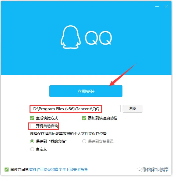 4.去掉【开机自动启动】勾选,修改路径地址中的首字符C可更改安装位置,本例安装到D盘,点击立即安装。