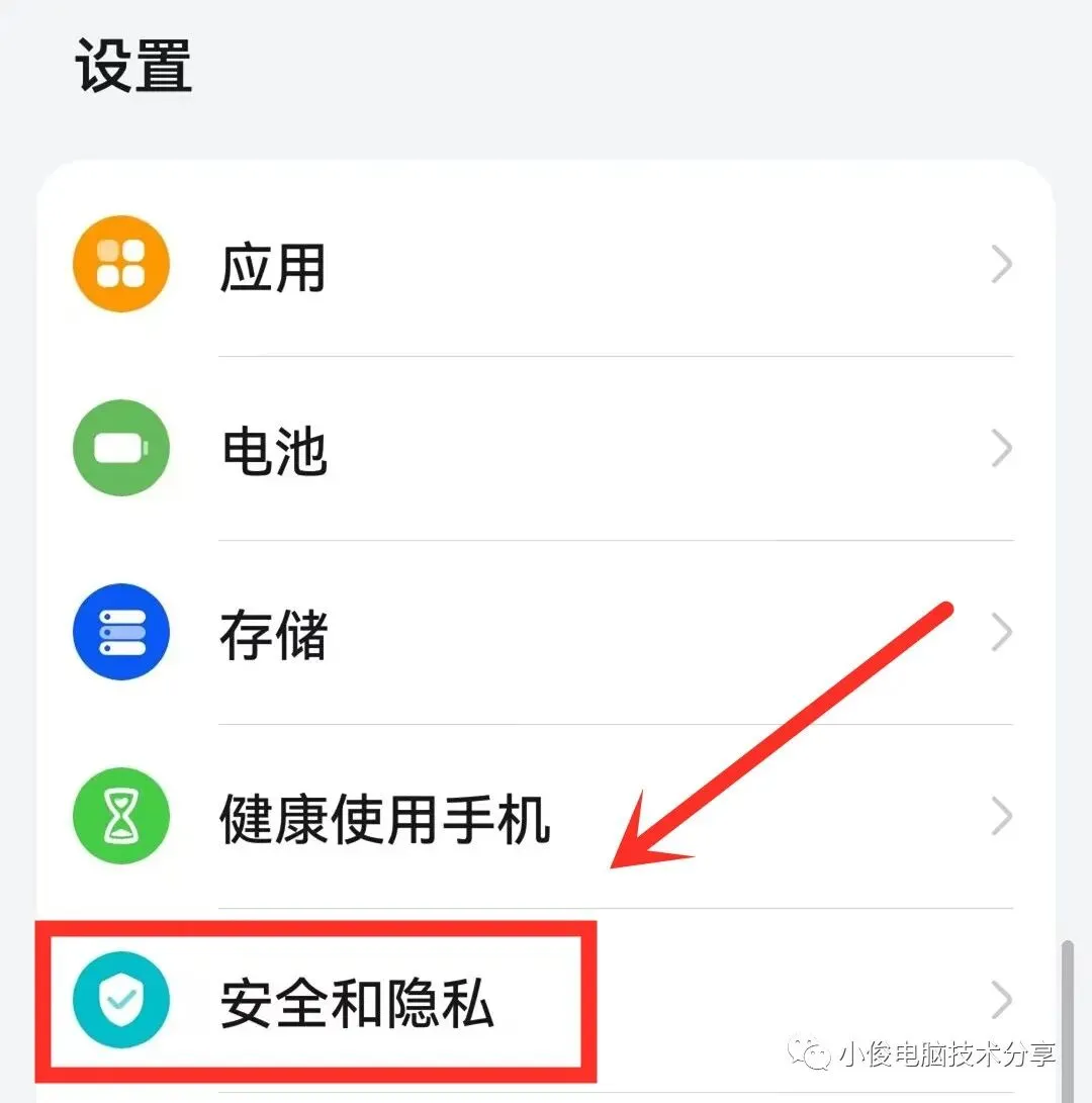 我们打开手机设置,接着点击打开下面的安全和隐私