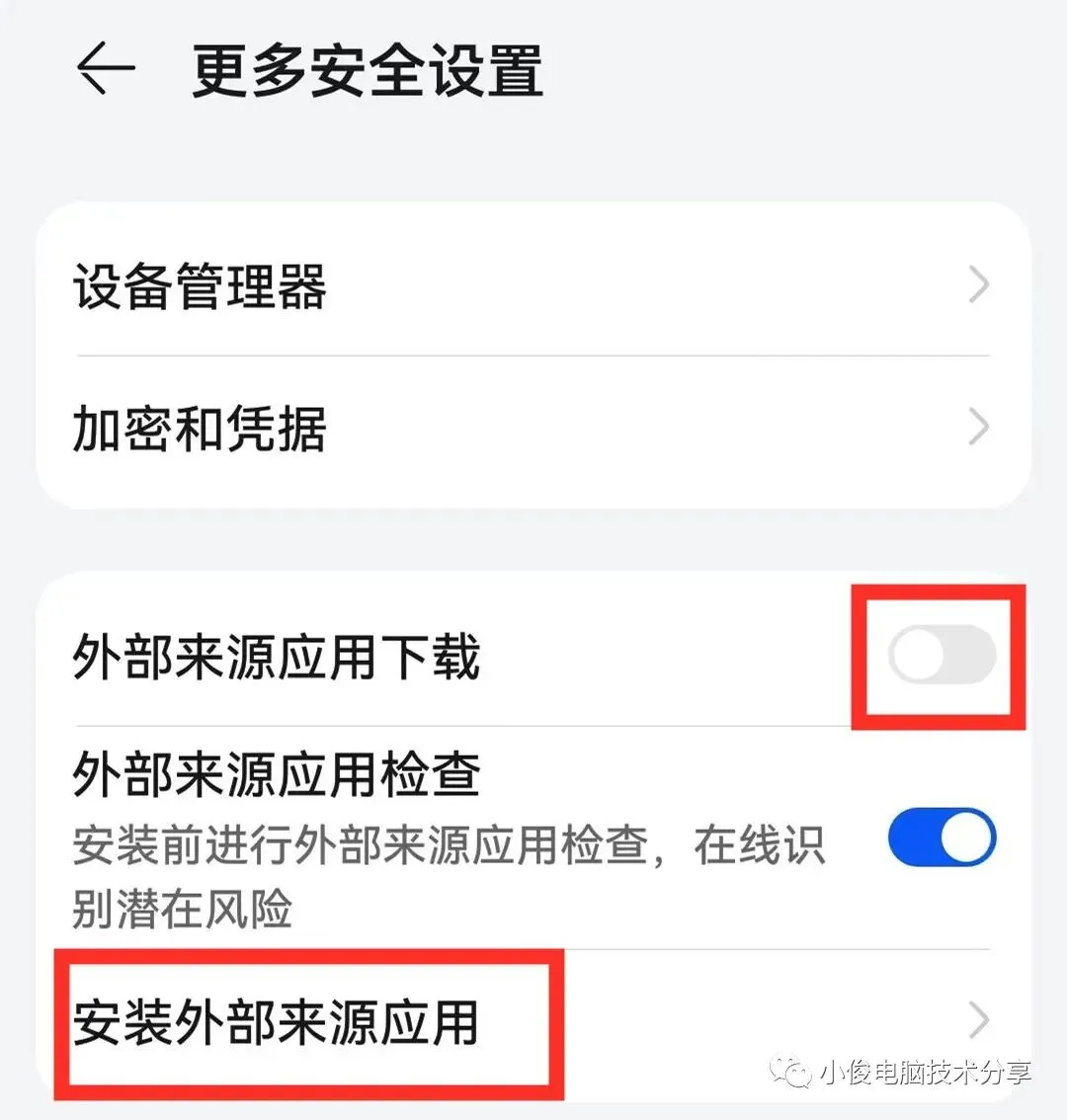 在这里就可以看到有一个外部来源应用下载了,此时我们需要把这个开关关掉,不然的话我们的手机就容易受到未知来源应用的攻击,这样就会导致我们手机上面的数据造成损坏,非常不安全,所以我们一定要把它关掉