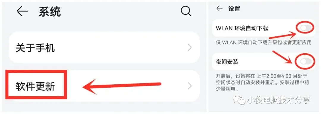 我们在手机设置里面,找到系统设置,然后选择软件更新,在这里我们把WLAN下自动下载更新,以及夜间安装这2个开关关掉,这样就可以避免手机在空闲的时候,自动升级更新系统和软件版本,从而让我们的旧手机也可以多用几年!