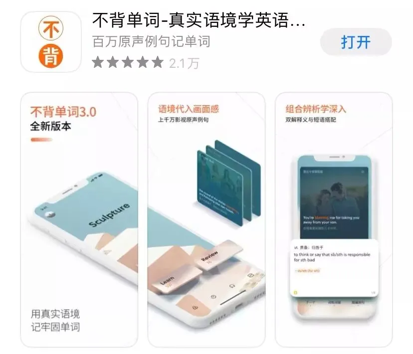 首先不用下载app,这是一大优点;另外每个单词配有无数个原声视频短片,直到你完全理解整个单词的意思,再往下轻轻一划进入下一个词汇,非常适合碎片化学习。同样配有不同词库可供选择。