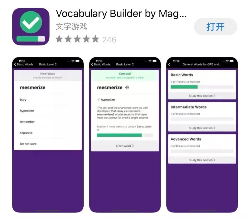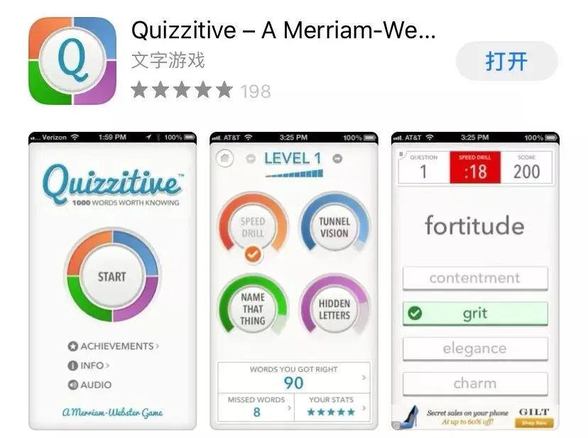 这款词汇游戏app出自webster,难度略大,最好玩的是倒计时选词,很有挑战性,当然每次升级也会成就感满满。平时用来阶段性检测自己词汇量还是非常不错的。
