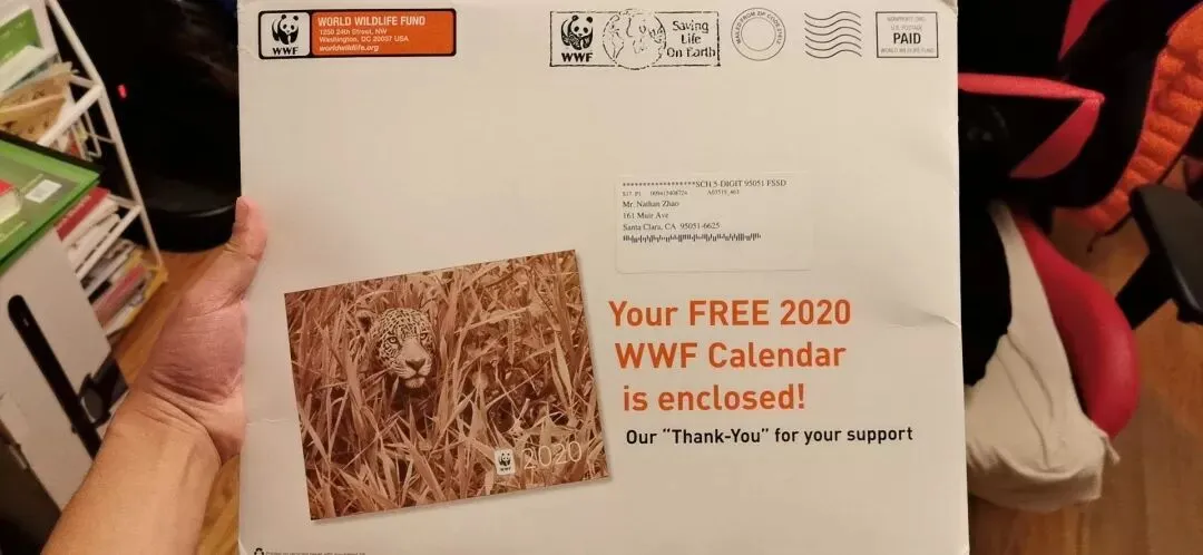 昨天收到了一个月历,是WWF(World Wildlife Fund,世界自然基金会)寄给憨憨的小礼物。