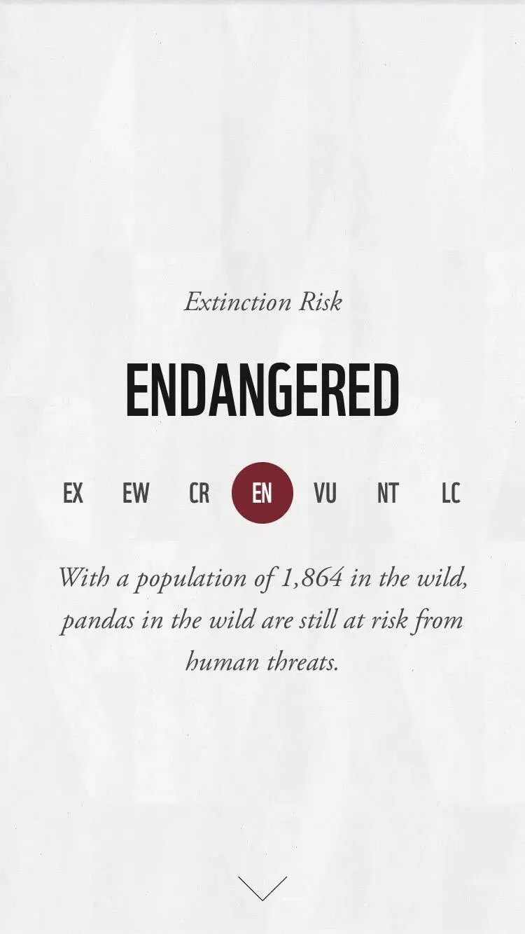第一个板块是熊猫的生存概况,这里讲解熊猫生存的地点,目前地球上有多少只熊猫,熊猫的体态特征等等。
