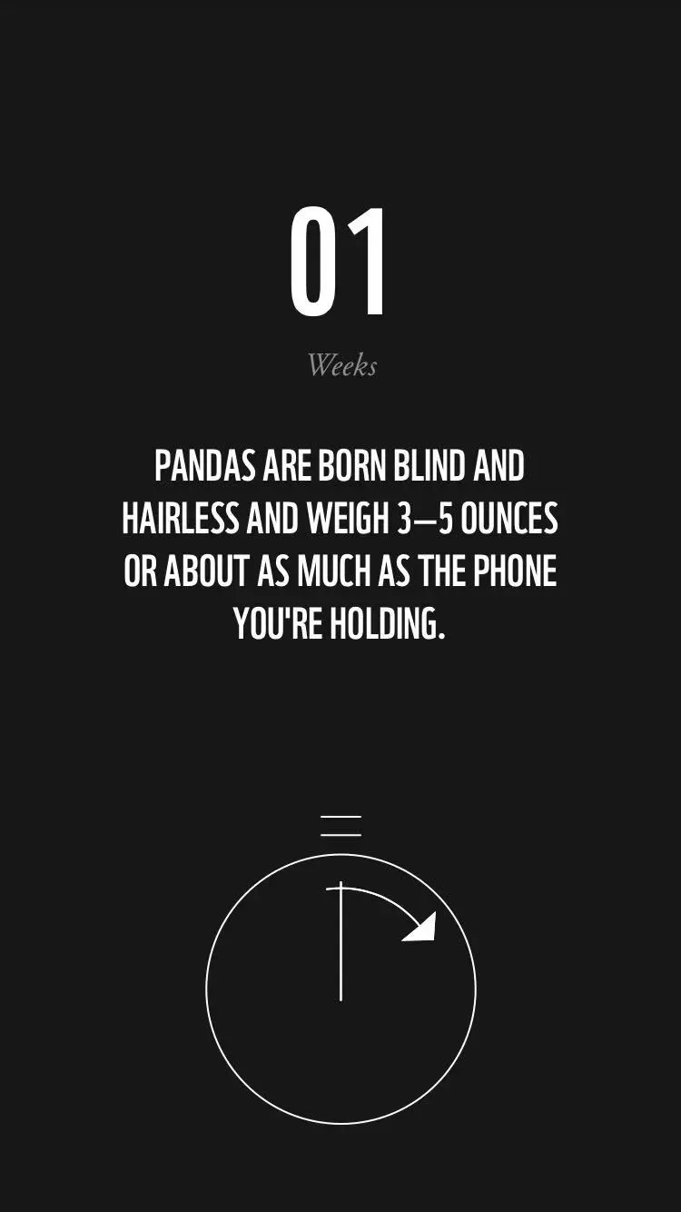 第六个环节很有特点,她根据熊猫出生的时间段,描写每个时间段熊猫的特点。比如下面这是第一周熊猫宝宝的特征。而且下方的时间条是可以转动的,转动一周熊猫就长大一些!很有创意!
