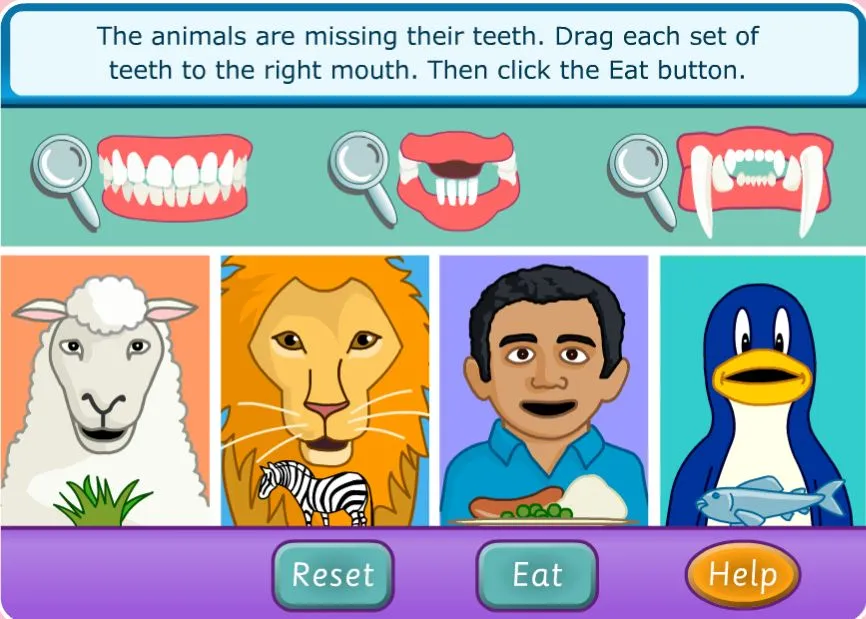 例如,教小朋友分辨不同动物牙齿形状的小游戏👇