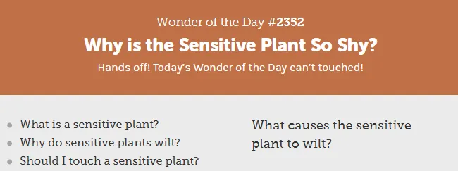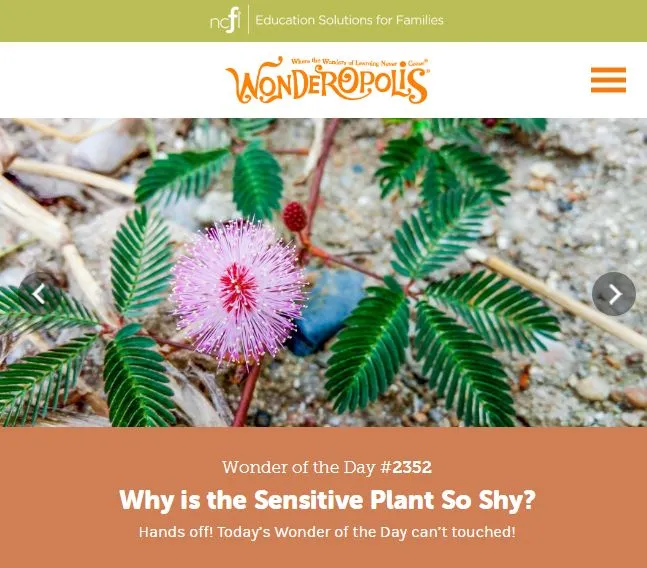 Wonderpolis是美国国立家庭读写中心的下属网站,是一个主要面向儿童的趣味科普教学网站,每天会有一个推荐文章,话题非常丰富,比如今天小E看到的话题就是”Why is the sensitive plant so shy(为什么有些植物那么害羞)”。