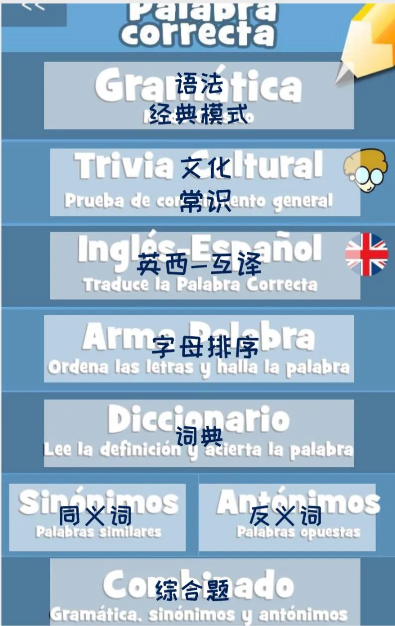 说起背单词的APP我们一直没有跟大家推荐过,因为我们觉得背单词 好!无!聊!啊!再怎么A或者P都无法避免这事情的无聊,试用了好几个都觉得很很鸡肋(特别是多邻国,太可怕了,竟然还有很多错误,已经路转黑)。在课堂上唯一跟同学们推荐过的是沪江开心词场,它是一个为中国同学量身定做的,适合各个级别同学的记单词APP(是否应该考虑给我们广告费?)。而这个Palabra correcta是西语母语人士做的,而且还包括了语法,同义词反义词,英西互译等更多内容,竟然还是免费的(就算收费也应该购买~就像西语助手的会员一样,因为用了你就觉得是值得的–真心推荐,真心没有广告费