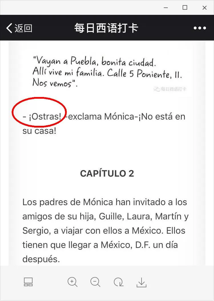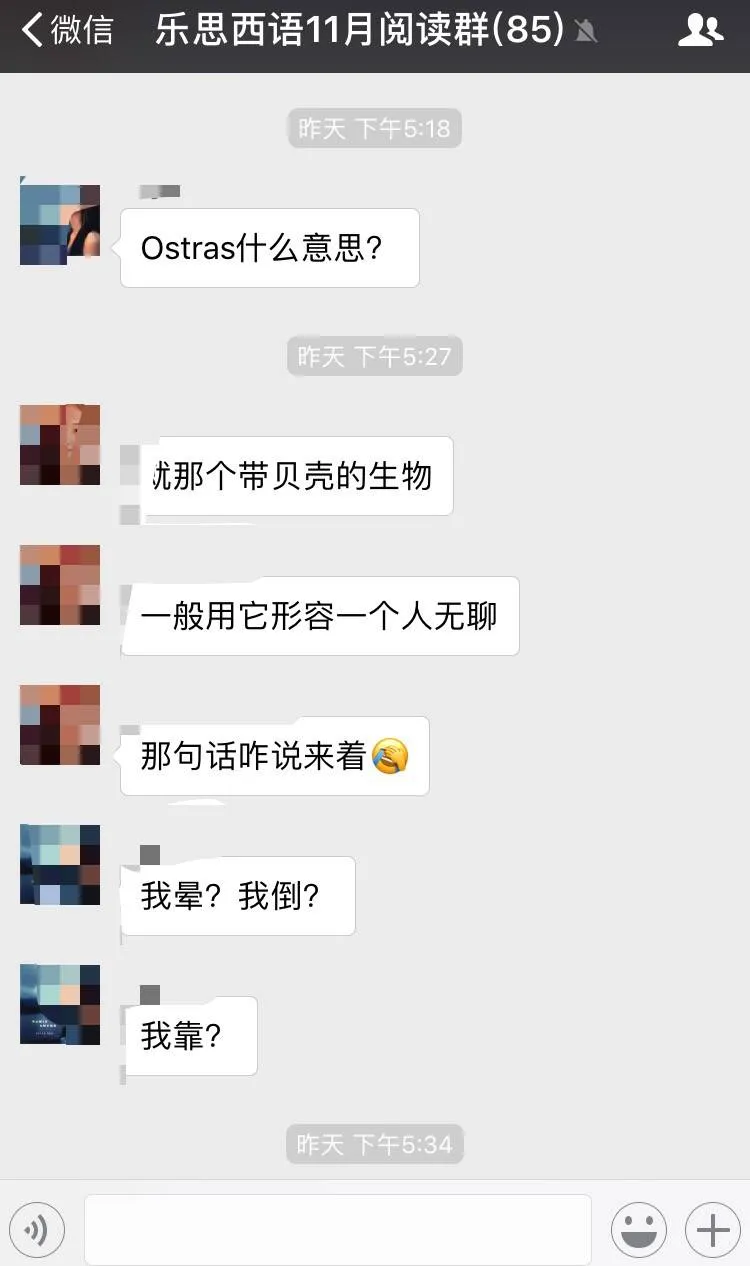 我们就知道它的意思肯定不是牡蛎啦~~~原来当西班牙人在表达突然,惊讶的时候,会说:“Ostras!” 这时候就相当于我们的 “啊!哎哟喂!我去!” 一位同学在我们的阅读讨论群中问Ostras的意思,大家还想到了它的另一个用法: