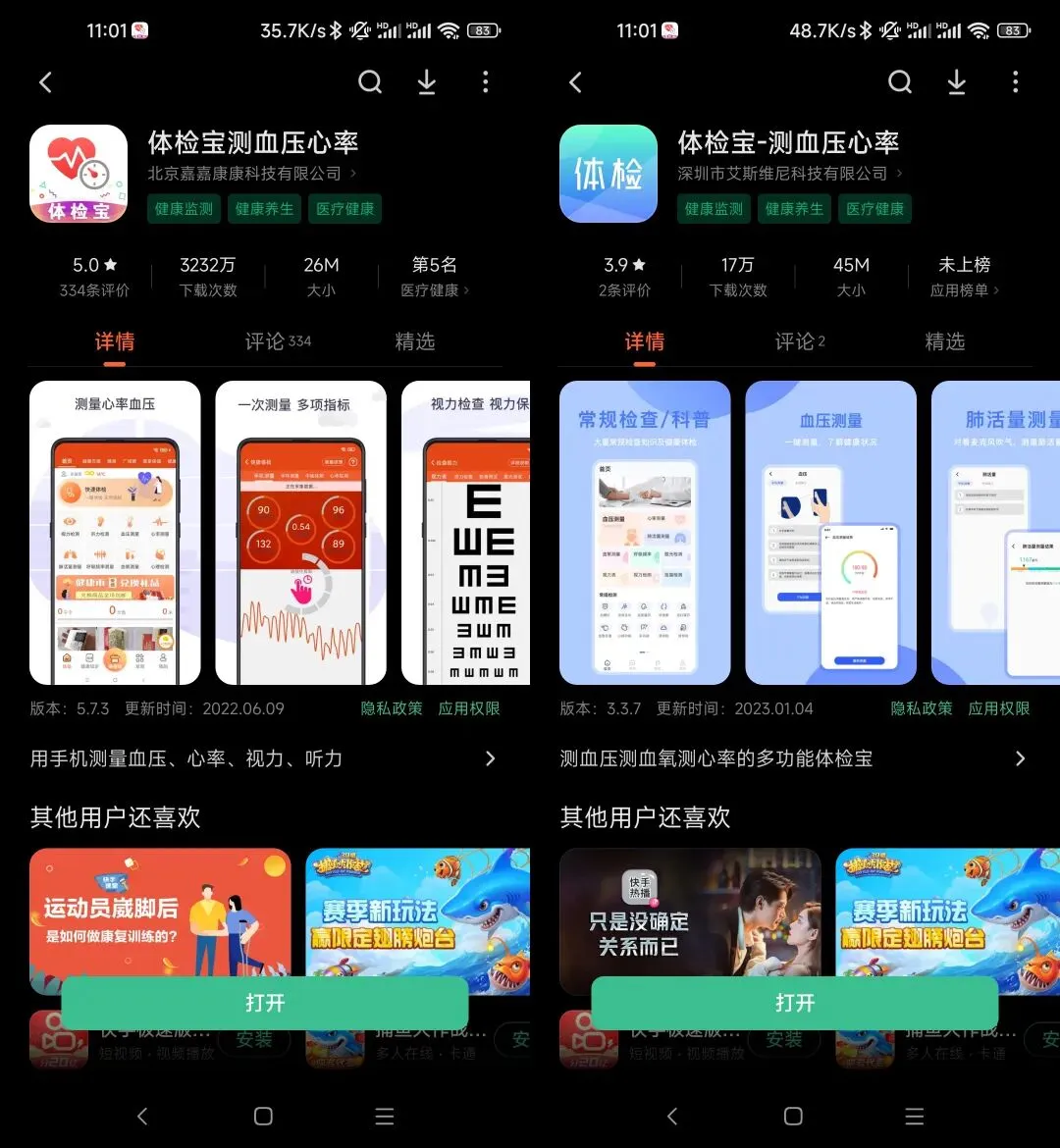 除了这款名为“体检宝测血压心率”的应用之外,在安卓平台上,还有另一款名为“体检宝”的应用。两者都不用注册、登录,也无须额外付费便可以实现血氧测量。