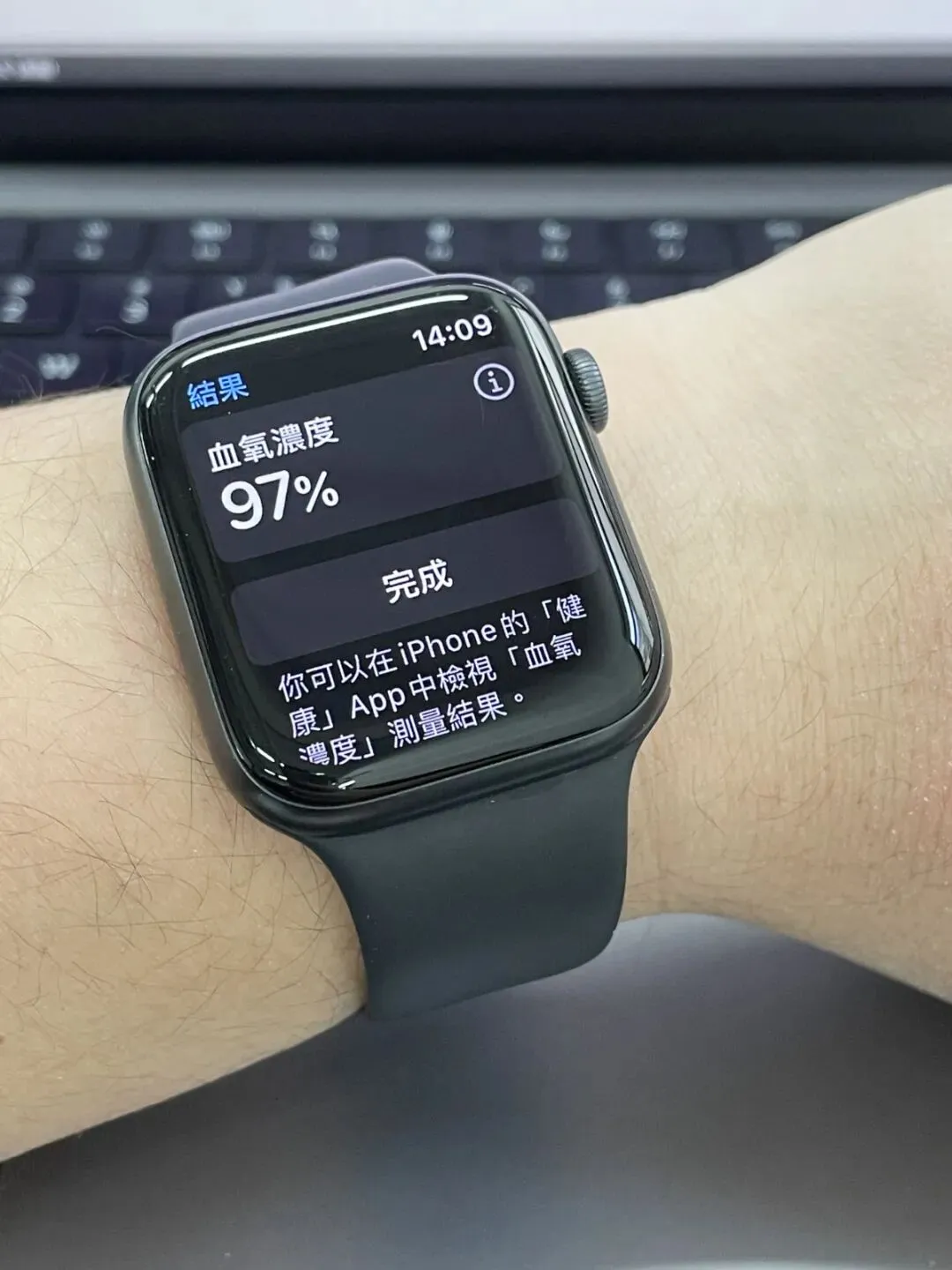 在屏息30秒后,血氧仪测得的血氧数值降低到了96%。Apple Watch也得到了相同的数据。