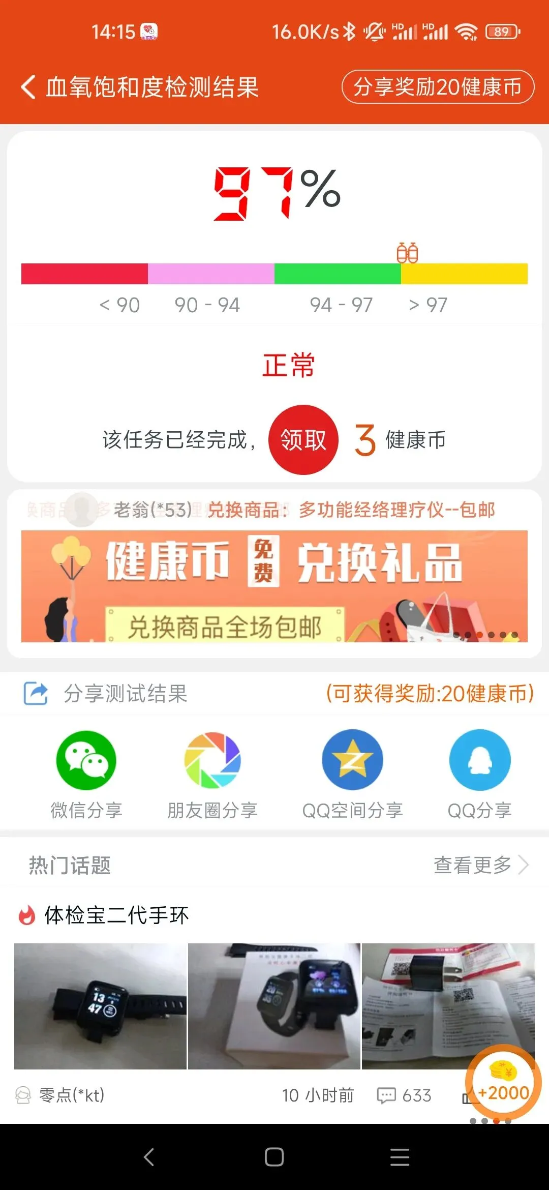 而在正常状态下,使用“体检宝测血压心率”这款应用,得到的静息血氧数据为97%。这一数据与血氧仪测得的数据是比较接近的。
