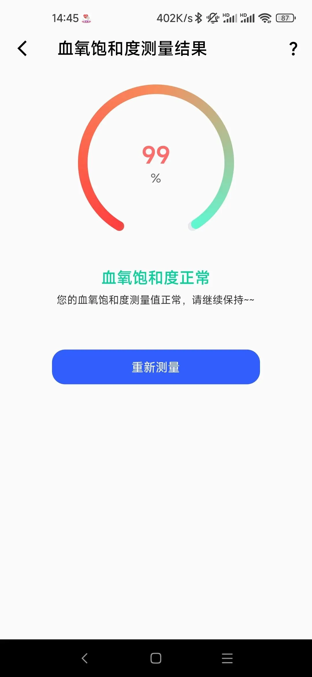 同时,当小黑忍不住大口呼吸后,应用显示的血氧数据很快回升到了98%。小黑觉得,这样相对灵敏的数值变化,体现出血氧测量应用还是有一定参考价值的。