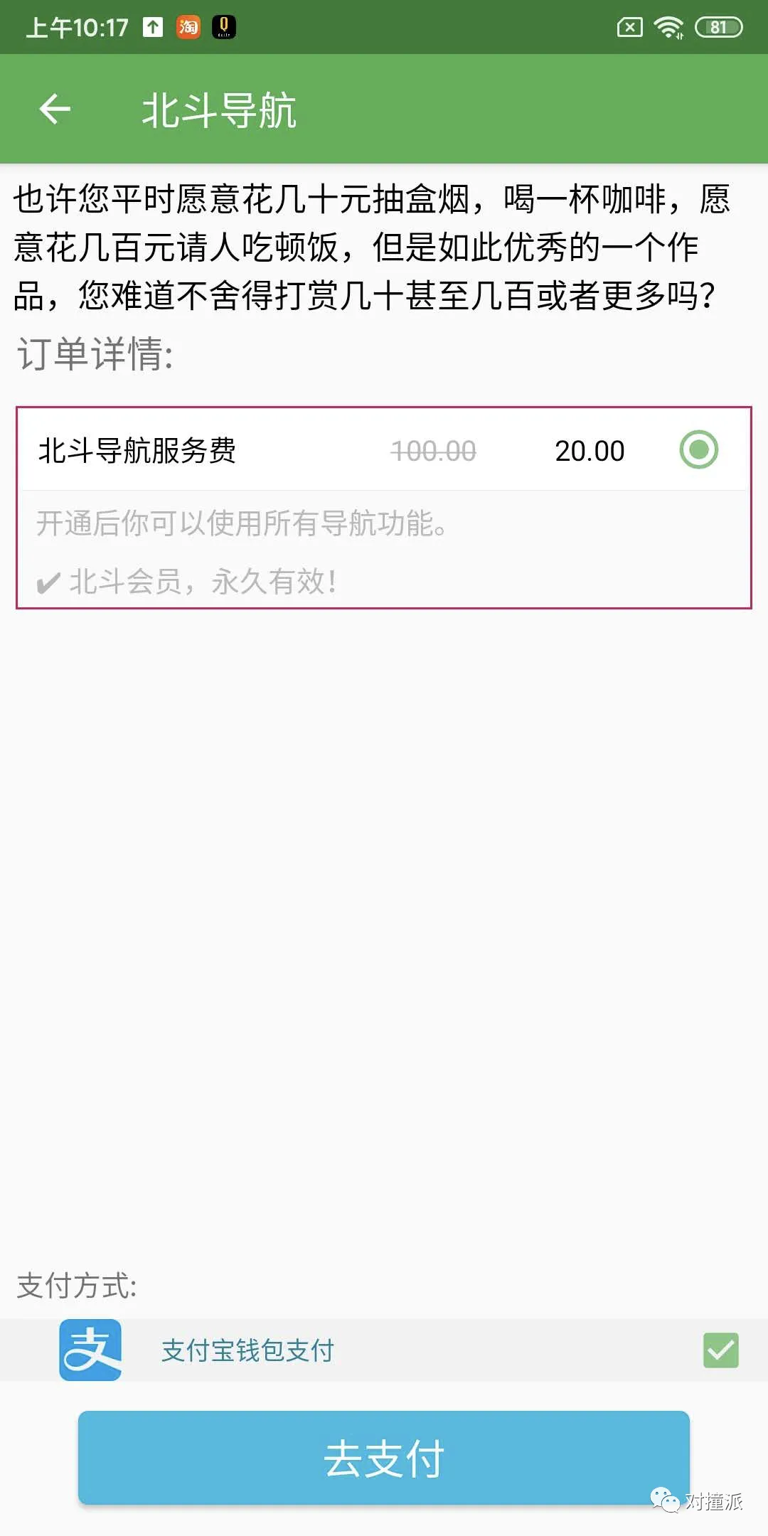 当你开始使用导航功能时,会用支付宝直接收费——还有一段义正言辞的文案: