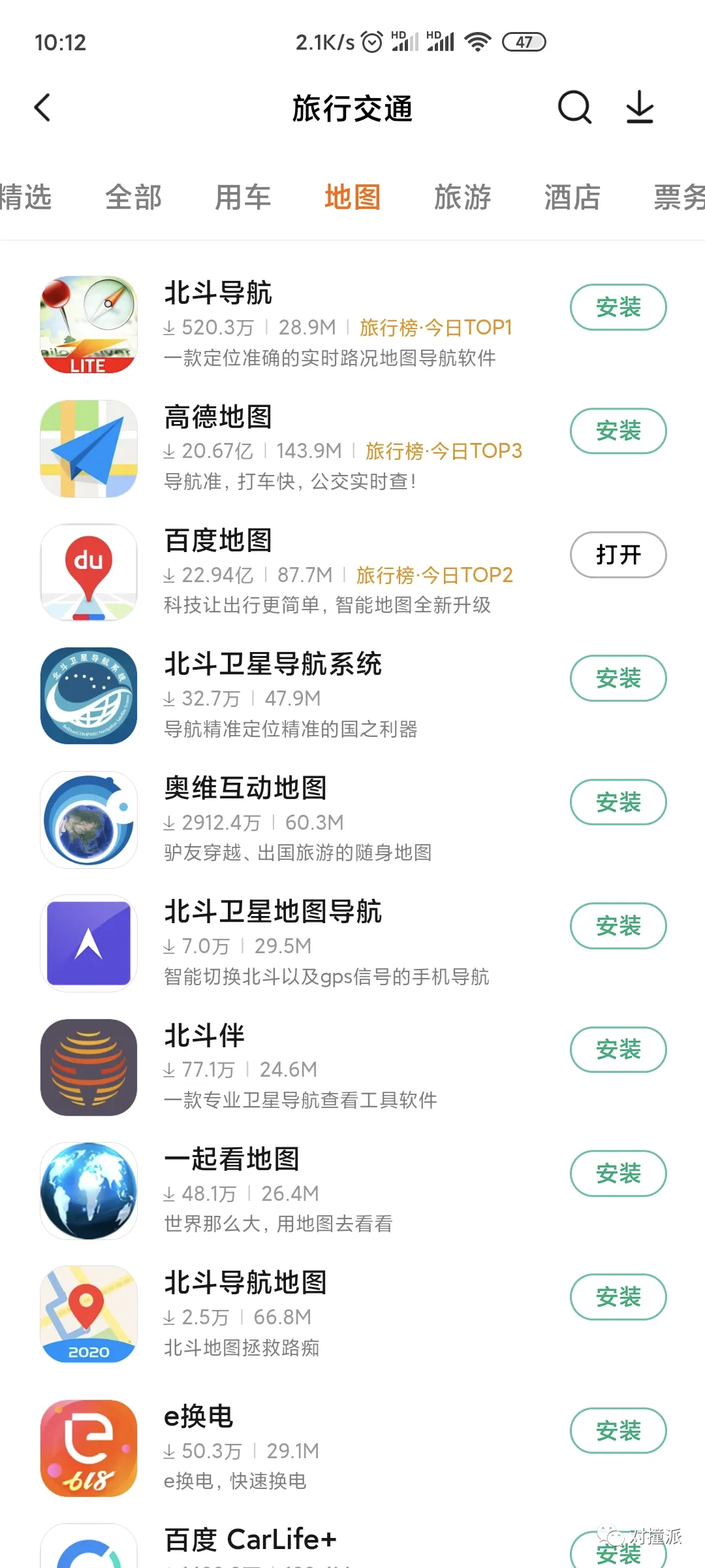 小米应用商店中,至少有6款以北斗命名的地图导航软件,下载量在2万~500万之间,甚至还有一款应用达到了当日地图品类下载量的榜首,超过了百度地图和高德地图。