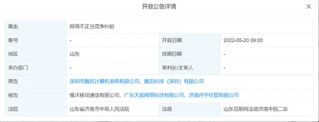 5 月 18 日,济南市中级人民法院一则开庭公告显示,腾讯起诉 vivo 网络不正当竞争案将于今日开庭。
