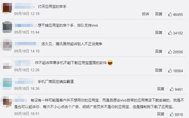 许多网友会在此事上声援 vivo:“一般都用手机自带的应用商场,安全放心!”“每家品牌都有自家的商店,vivo 手机用 vivo 自家的应用商店,合情合理。”