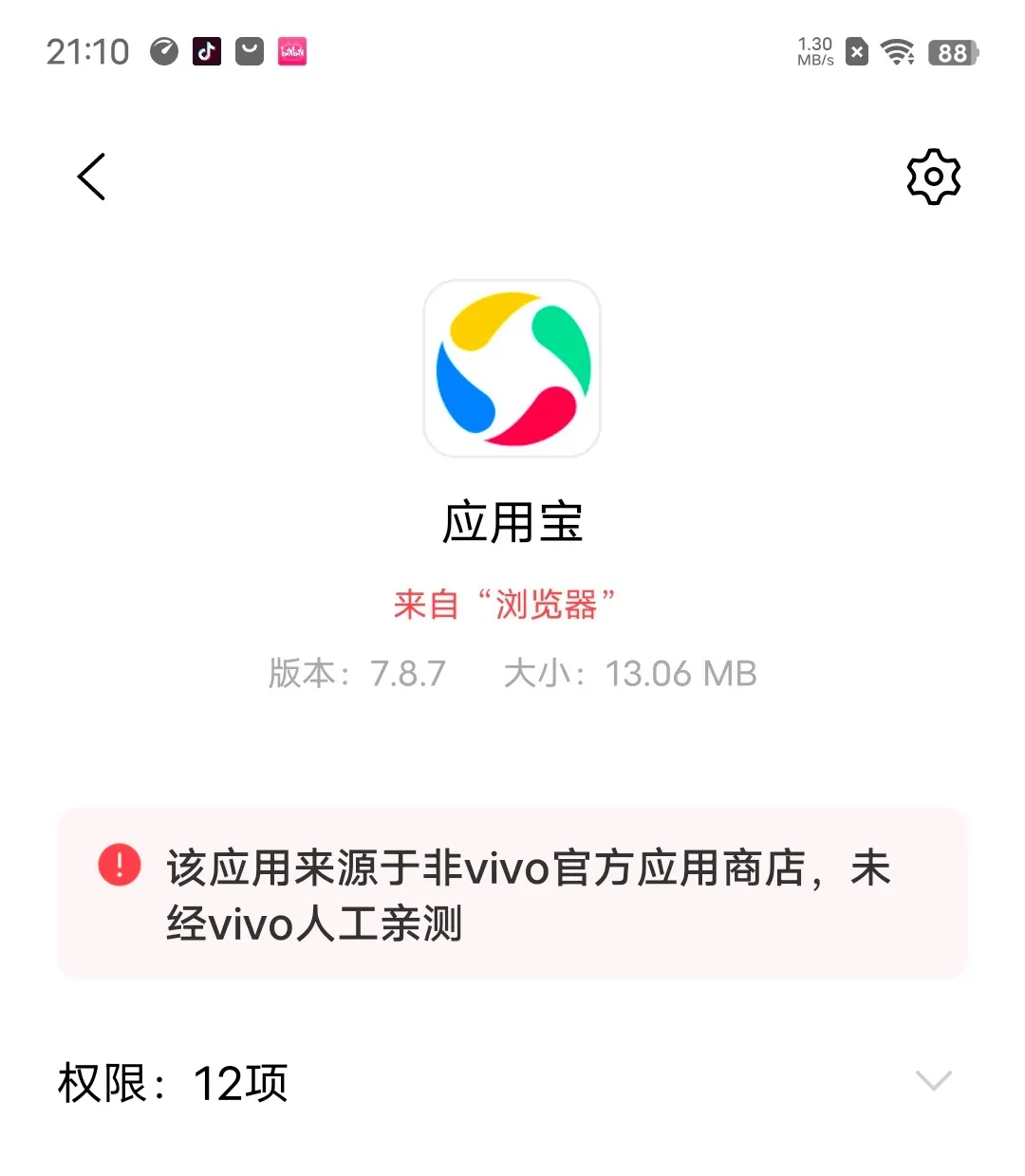 有数码博主用 vivo 手机商城尝试搜索应用宝,发现搜索不到,只能通过浏览器进行搜索,且安装时会有提示“非官方应用商店 APP”,但通过浏览器可以正常安装。