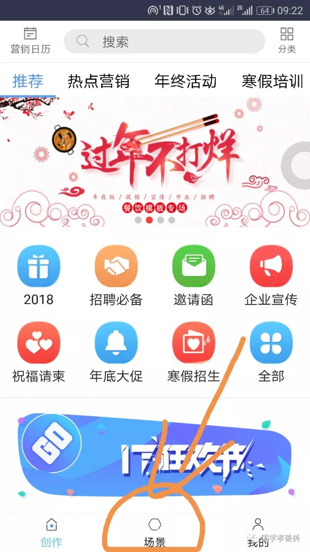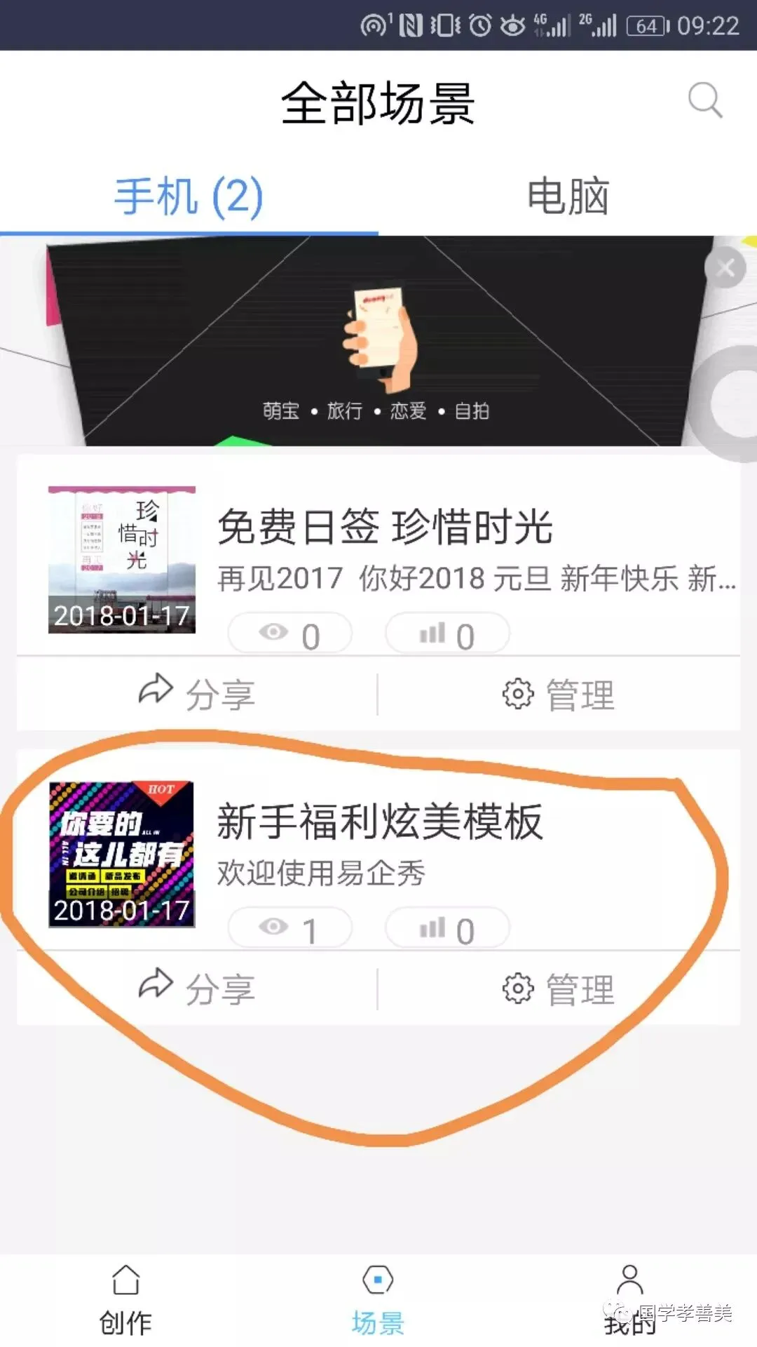 3、登录之后,先免费制作一篇文章实习实习,点最下面的“场景”,里面有新手制作模板(如果比较熟悉了,就可以直接点左边的“创作”,购买一些喜欢的模板):