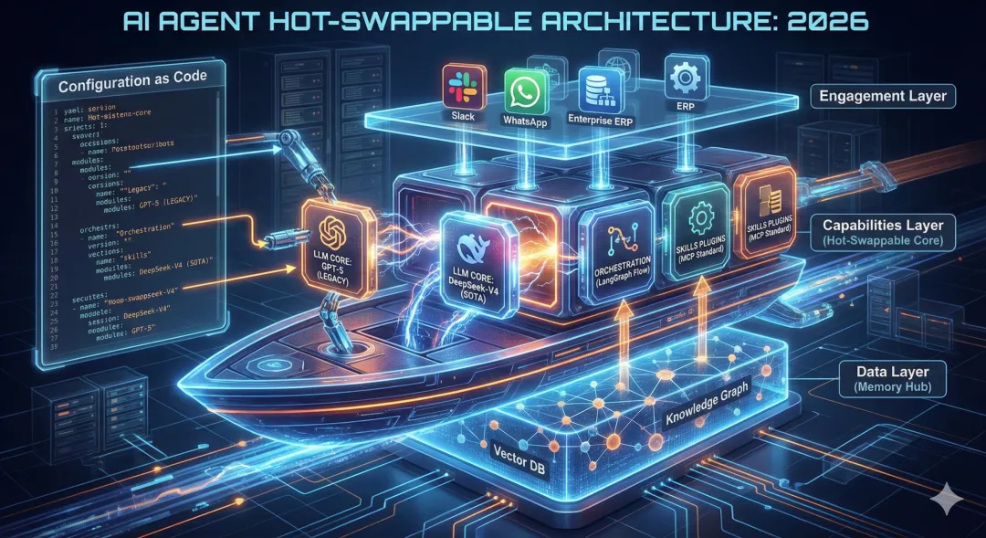 这一概念借鉴自服务器硬件领域的”热插拔”技术,即在不关闭系统电源的情况下更换组件。在AI语境下,它意味着企业可以在Agent运行过程中,动态地替换底层LLM(如从GPT-5切换到DeepSeek-V4)、更新Prompt策略、加载新的技能插件(Skills),甚至重组整个多智能体协作网络,而无需让业务停摆。