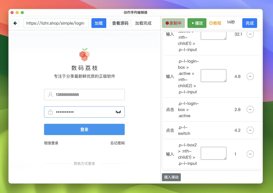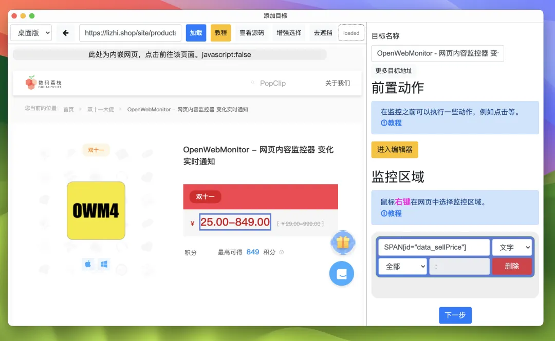 使用起来也非常简单。以购物网站为例,输入网址后,可以先设置一下前置动作,在正式监控前加入一些自动的模拟操作,比如模拟账号登录。
