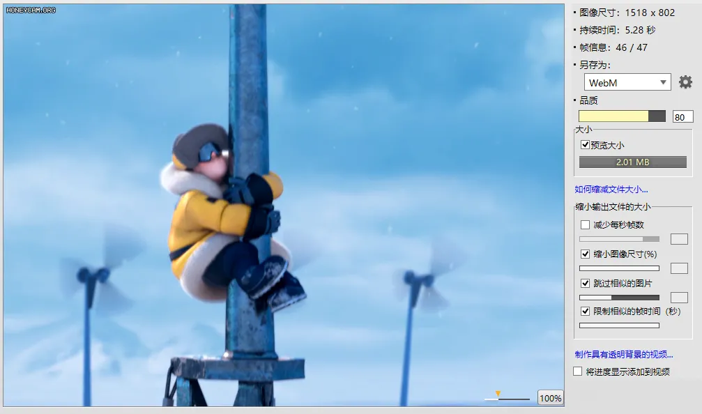 Honeycam 还能通过量化处理技术,创建出高质量的 256 色动画,以保证在同样的体积小,实现更高清晰度的效果。