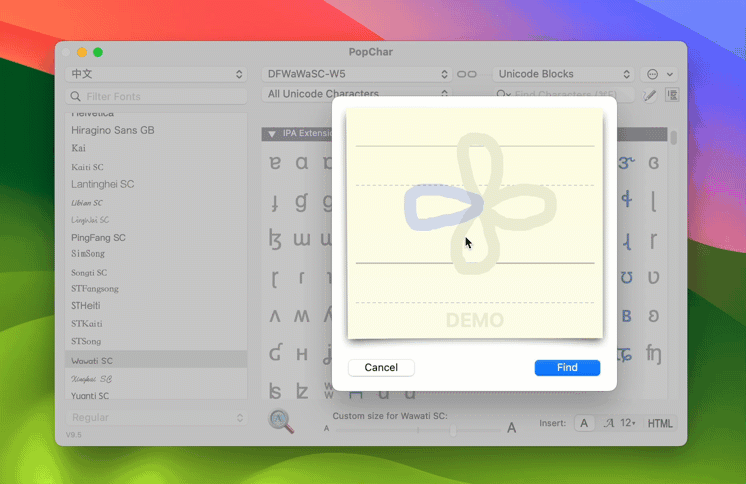 除了通过输入相关字符来搜索之外,PopChar 还提供了「形状识别」功能,用户只需要在屏幕上绘制出近似的形状,也一样能找到想要的字符。