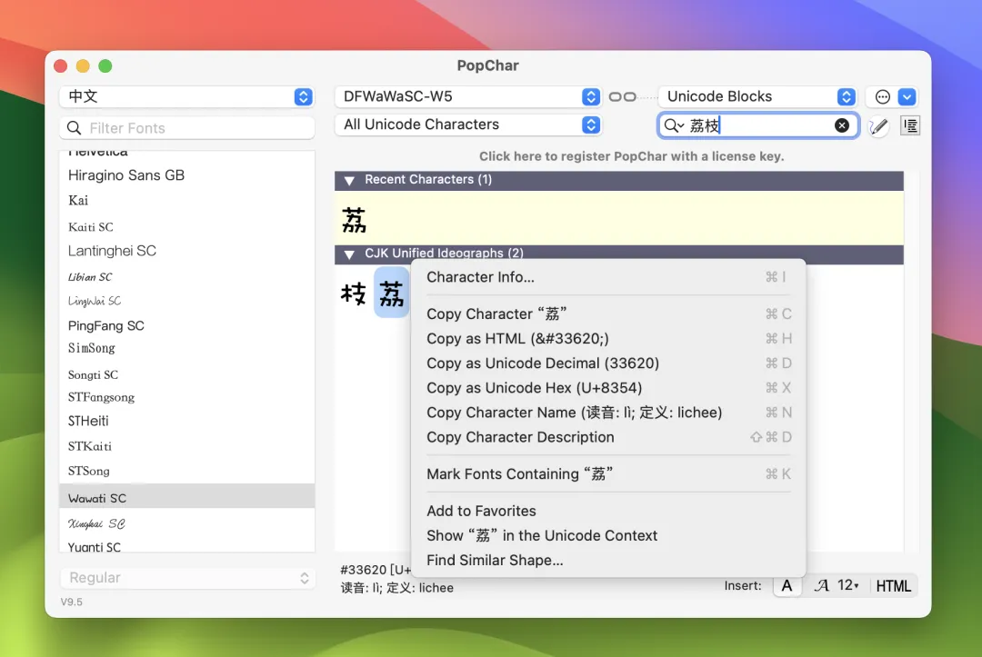 找到想要的字符后,在右键菜单中就能拷贝该字符的各类编码,比如 HTML / Unicode Decimal / Unicode Hex 等,可以很好地满足不同场景下的使用需求。