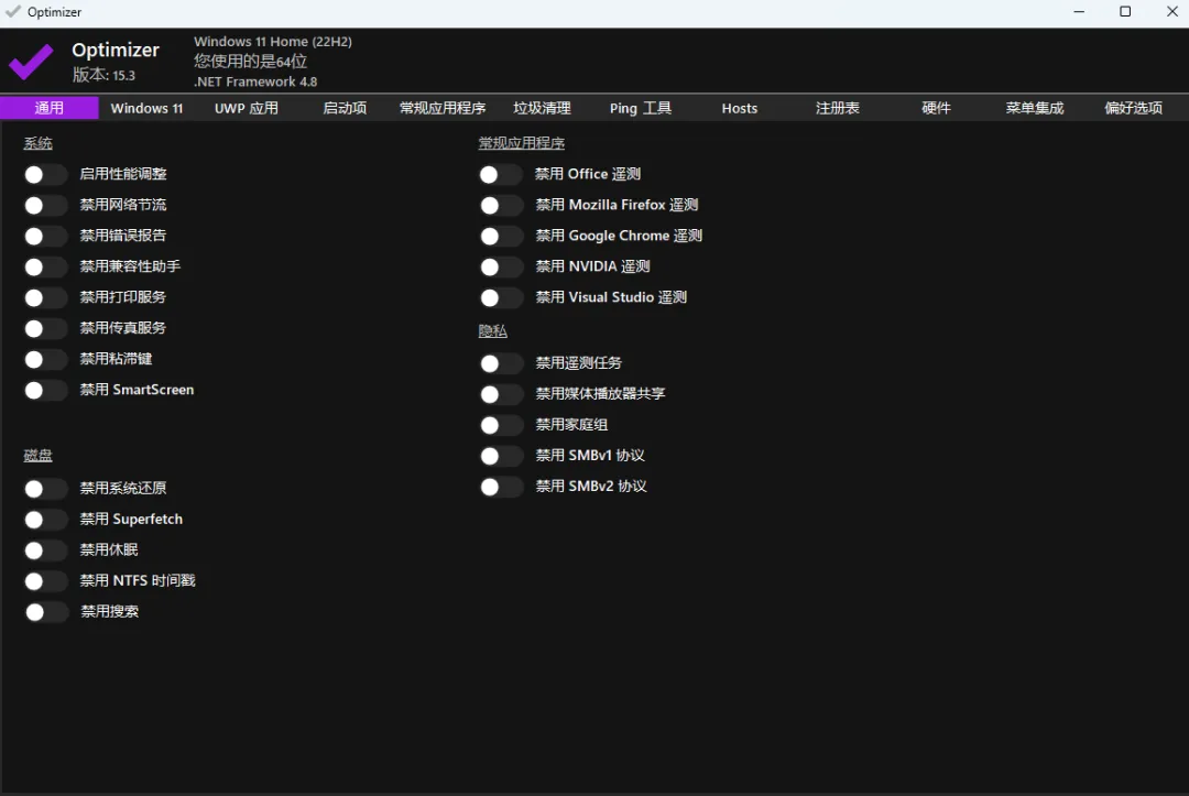 软件体积仅2.13MB,但功能却极其丰富,诸如系统管理、磁盘管理、隐私、Win11管理、启动项管理、垃圾清理、Ping工具、Hosts、注册表、硬件等常用功能均是一应俱全。