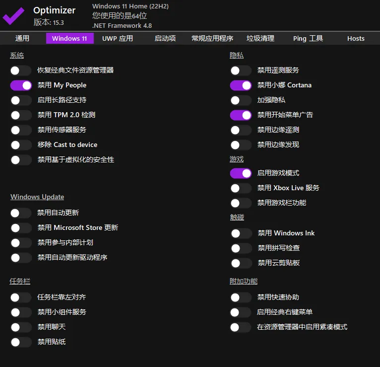 比如Windows11管理里面,一键恢复经典文件资源管理器、禁用人脉、启用长路径、禁用小娜、禁用开始菜单广告等日常装机后需要手动调整的功能,在Optimizer均能一键搞定