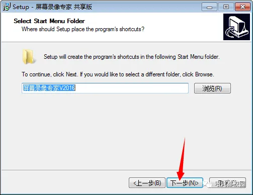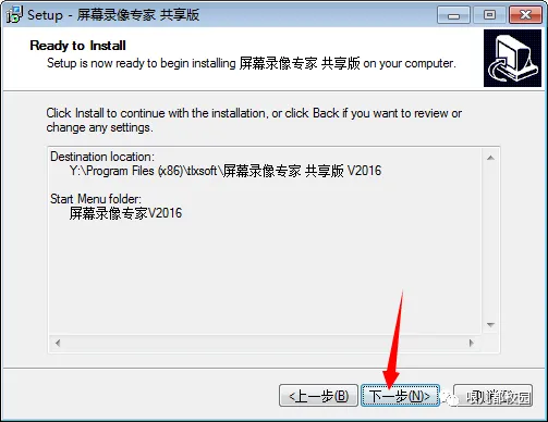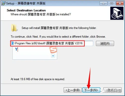 5.选择安装目录,默认安装在 C:\Program Files (x86)\tlxsoft\屏幕录像专家 共享版 V2016(建议安装在除C盘以外的磁盘上,可以直接将C改成Y,安装到Y盘),然后点击“下一步”